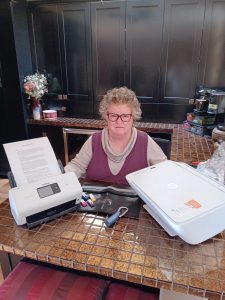 EIC President Jackie Dunagan is shown here getting the scanner ready to copy vital documents onto a colorful thumb drive for safe keeping. The copier shown here can be used to transfer odd sized materials into the proper size for scanning. The scanning and thumb drive are free. Also available will be the optional waterproof container for the thumb drive and the fireproof document holder shown in the photo.
